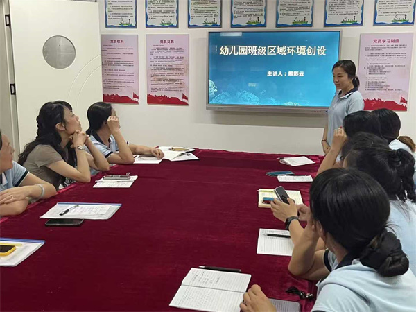 熊老师以“幼儿园班级区域环境创设”为主,将她在培训中学习的知识与老师分享。其中围绕“区域空间规划合理性”“材料投放层次性”等方面进行深度交流。助力教师挖掘区域活动的教育价值,打造更符合幼儿发展需求的成长空间。