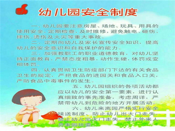 我园对教学设施、器械、楼道、校门处、护栏、供水供电以及消防安全等设施实行定期的安全检查和不定期的排查,消除一切安全隐患。老师们也进行相关的安全培训,提高认识,加强责任心,杜绝不安全事故发生。幼儿园内安全具体事宜如下: