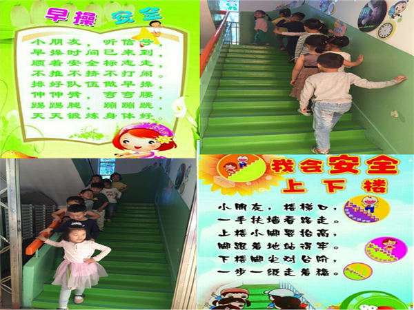 早操时间到,小朋友们快排好队,我们一起去锻炼身体吧!教育幼儿在上下楼梯时不要拥挤,不推拉,手扶好按秩序的靠右行走。