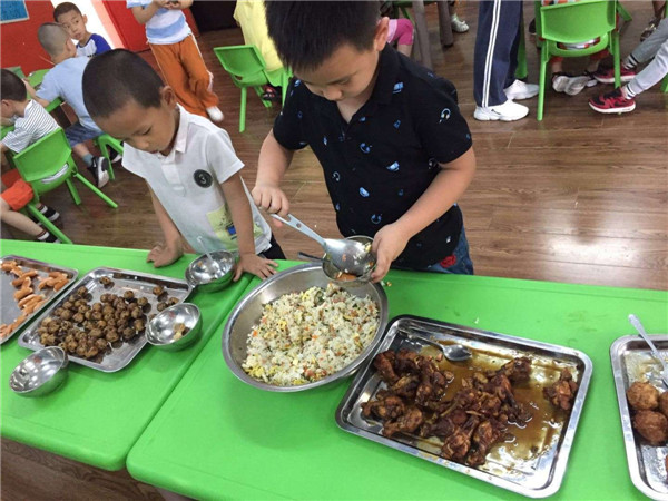 丰富的菜肴和各种主食让幼儿大饱口福,幼儿在愉快的环境中自由地选择自己喜爱吃的食物,一些孩子偏食、挑食的习惯,通过自助餐活动也得到了一定程度的纠正。在自助餐活动中,孩子们学会了等待、谦让,养成了文明用餐的行为习惯,使自己的自我服务能力在活动中不断提高,同时体验到自助午餐的自主、快乐。