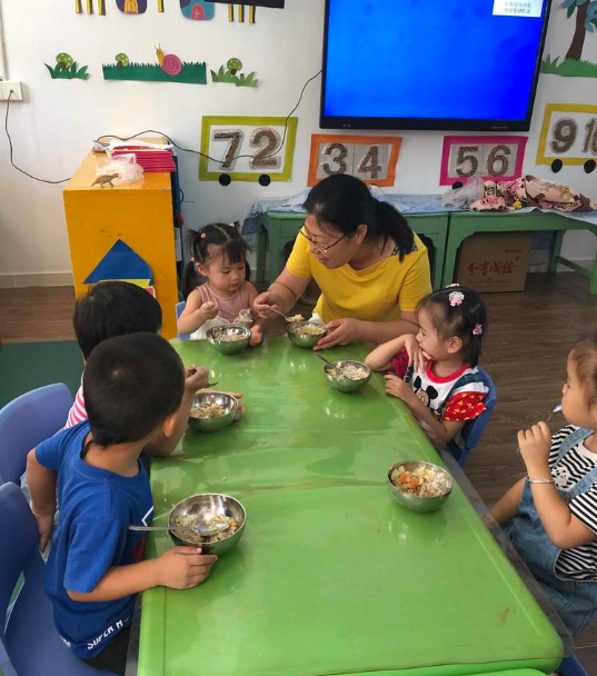 “今天的菜量孩子们够吃吗?”“孩子们吃得好不好?”“宝贝们,你们要一口饭一口菜,搭配着吃哦。”……午餐时间到了,黄丽玲院长走进班级,与孩子们一起用餐,为他们舌尖上的安全保驾护航。
