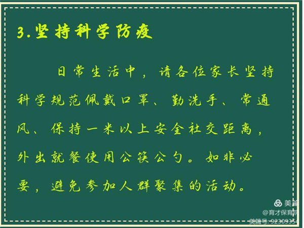 当前国内疫情仍有零星出现,请家长们进一步提高警惕,切勿麻痹大意。让我们继续努力,齐心战“疫”,全力筑牢抗疫“防护墙”,保证孩子的身体健康和生命安全!