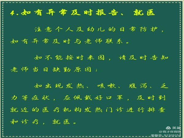 2.家长要密切关注幼儿及自身健康状况,每天早中晚坚持检测体温,如出现发热(体温高于37.3℃)、干咳、乏力、鼻塞、流涕、咽痛、腹泻等症状,第一时间上报幼儿园,做到不隐瞒,不入园,并及时按规定去定点医院就医。幼儿复课需提交就医院痊愈证明方可入园。