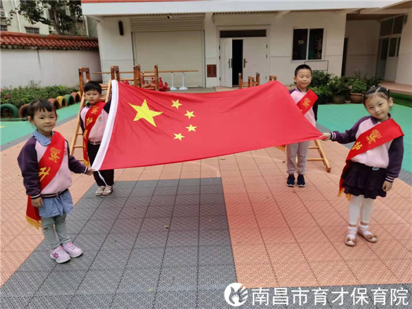 2021年10月11日上午,南昌市育才保育院举行了升旗仪式。穿戴整齐的孩子们在老师们的带领下,整齐有序地排好了队伍,等待着升旗仪式的开始。小旗手们也早已准备就绪,严阵以待,护卫着鲜艳的五星红旗。出旗音乐声响起,护旗手们步履铿锵、大步向前。全园师生行注目礼,注视着五星红旗冉冉升起。