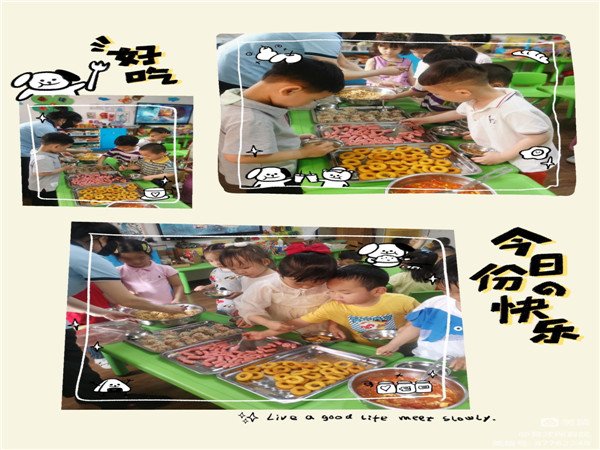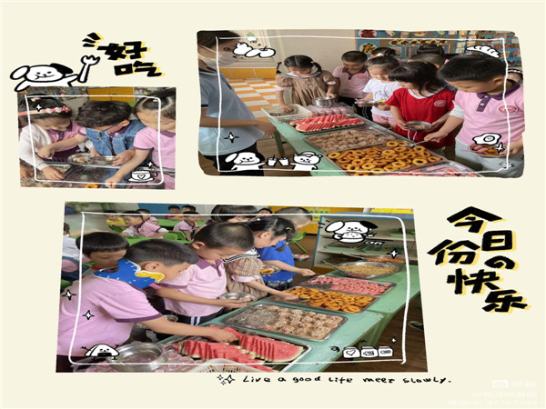 为了庆祝六一儿童节,让幼儿体验不同的进餐形式,同时让我们的节日过得更加丰富,我们中午还特开展了自助餐活动。