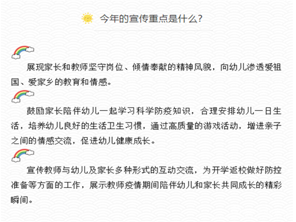 近日,教育部办公厅印发《关于开展2020年全国学前教育宣传月活动的通知》(教基厅函【2020】11号)文件精神。这是第九个全国学前教育宣传月活动,活动主题为“特殊的时光,不一样的陪伴”,活动时间从5月20日至6月20日。