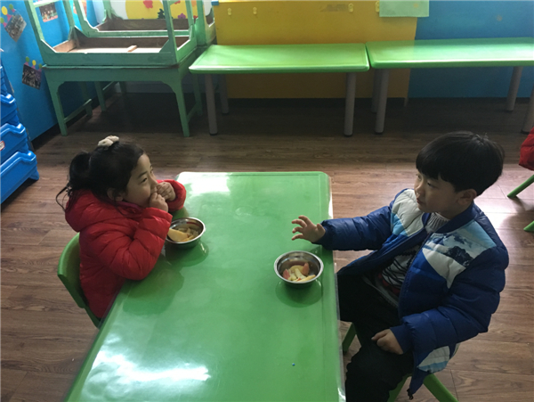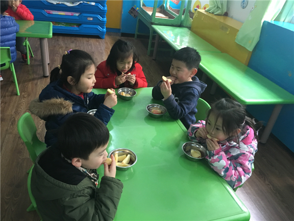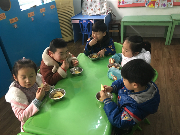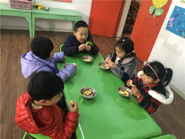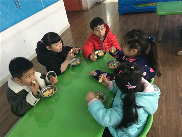 幼儿园的苹果真脆呀!一口咬下去,咔呲咔呲的!