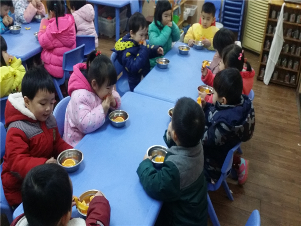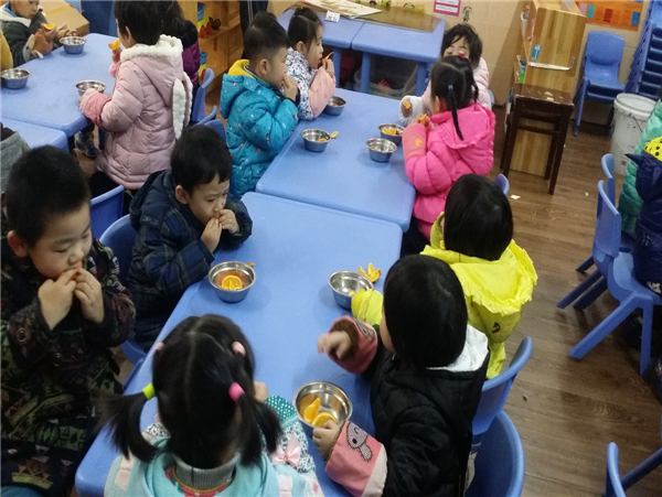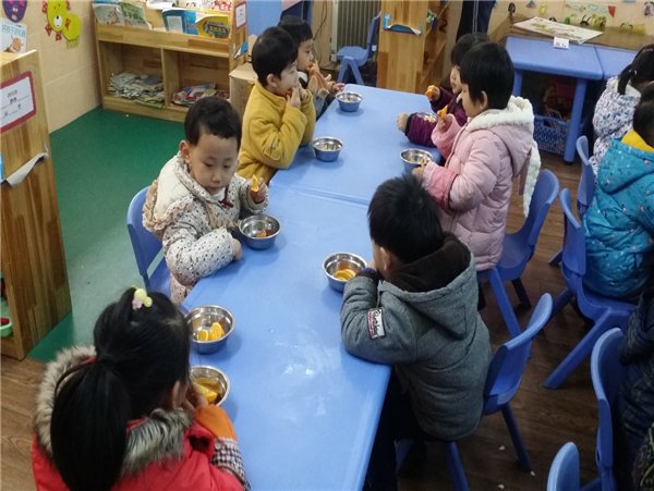 2015年12月24日,我们的点心是水果橙子,橙子真甜啊,甜到我们的心里去了,但是吃完后,水果皮不能乱丢哦~要把它喂给垃圾桶宝宝。