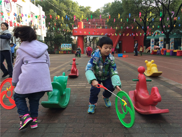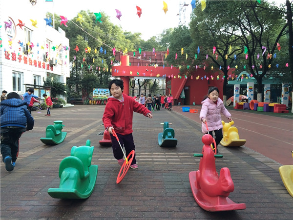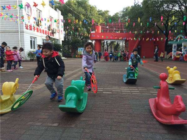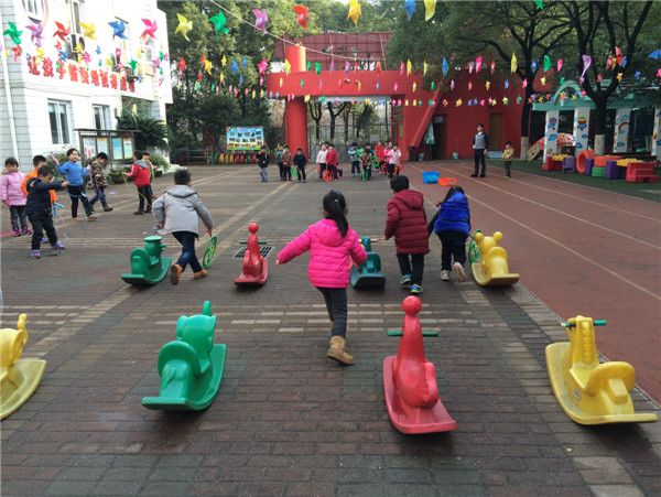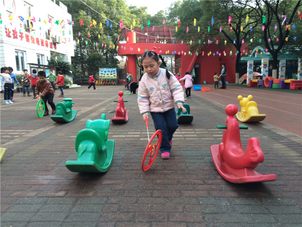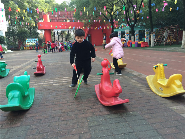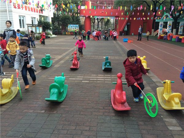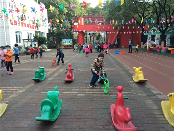 今天,开展的户外活动是玩风火轮,小朋友来了一场风火轮大竞技。先分成四组,在起跑线后站好。比赛开始,第一个小朋友用自己的“风火轮”向前滑行或滚动前行,并且要绕过前面的障碍物再返回,将“风火轮”交给本组的第二个小朋友,最先完成的一组获胜。